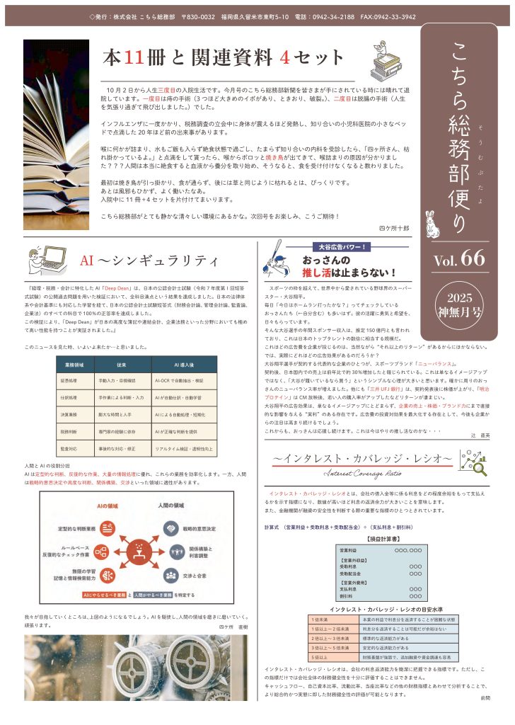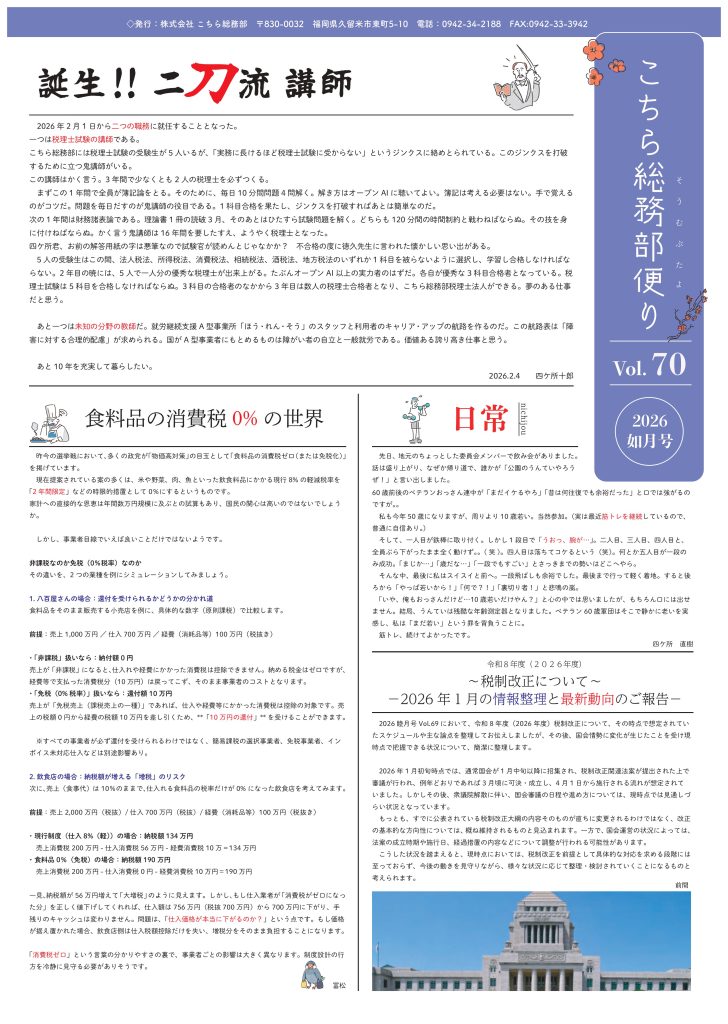 毎月発行の、弊社からのおたよりです。税務、時の話題等々が満載です。ぜひお役立てください。